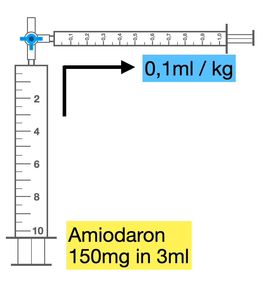 Bei pur aufgezogenem Amiodaron (150mg auf 3ml = 50mg/ml) ist die Applikationsmenge genau gleich:
