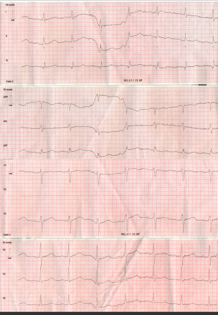 Etwa 30 Minuten nach Eintreffen am Einsatzort wird noch auf der Treppe dieses 12-Kanal EKG abgeleitet. Das ganze Ausmaß der Kaltschweißigkeit des Pat. wird erst beim Hochschieben der letzten Kleidungsschichten ersichtlich. Die Anlage der EKG Elektroden ist dadurch extrem erschwert.