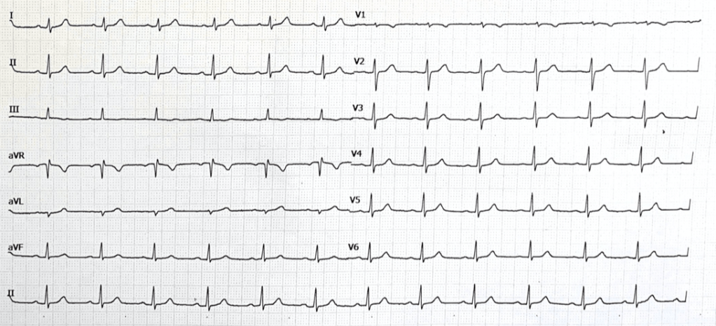 Nach kurzer Recherche ist klar: Das EKG wurde falsch geschrieben – die Arm-Ableitungen (rot und gelb / RA und LA) wurden vertauscht. Nach Korrektur sieht das EKG wieder normal aus.