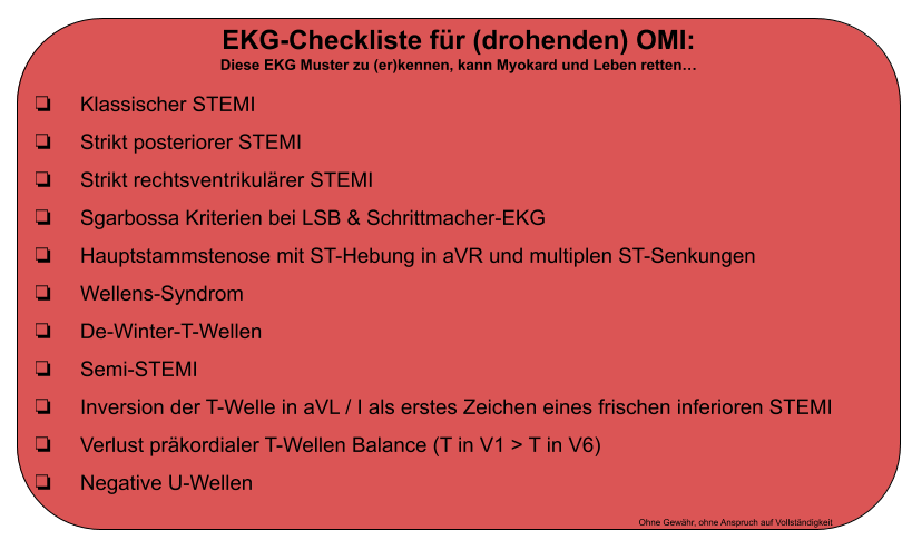 Da die STEMI-Kriterien sehr stark im Mittelpunkt der Infarktdiagnostik stehen, ist nur wenig Wissen über weitere Hochrisiko-EKGs für okklusive Myokardinfarkte verbreitet. Zu diesem Zweck hier einmal eine kleine Liste mit verschiedenen EKG-Bildern, die allesamt hochverdächtig für einen (drohenden) OMI sein können. In diesem Artikel soll nicht speziell auf die konkreten EKG-Bilder eingegangen werden, die Liste soll lediglich eine Übersicht darstellen. Vielleicht kann sie ja zur Eigenrecherche anregen! 🙂
