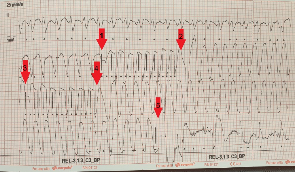 Nach zwei erfolglosen Versuchen schockt der implantierte Defibrillator/ICD (es ist wohl doch nicht nur ein Schrittmacher…) nun (5. Pfeil) und kann im Anschluss daran einen normofrequenten Rhythmus (hier a.e. Vorhofflimmern) etablieren. Während des Schocks war die Patientin wach gewesen und hatte somit den kurzen, aber starken Thoraxschmerz bei vollem Bewusstsein mitbekommen.