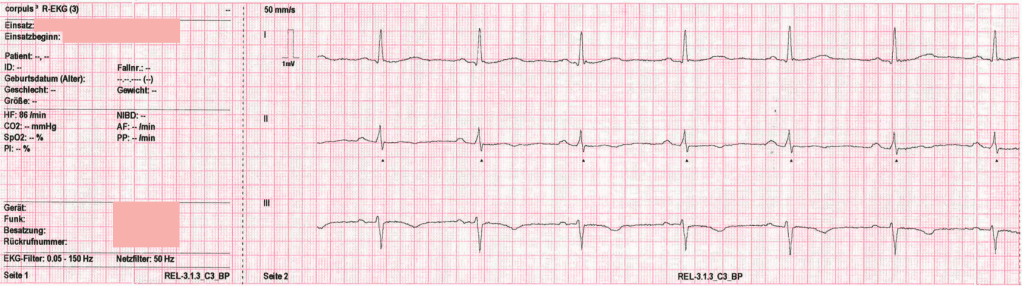 Eine erneute RR-Messung ein paar Minuten später ergibt einen Blutdruck von 95 mmHg bei unveränderter Herz- und Pulsfrequenz. Die Patientin meint den Schmerz nun etwas bauchbetonter zu verspüren.