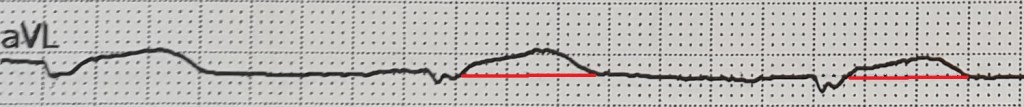 Außerdem ist bei I und aVL die ST-Strecke ungewöhnlich begradigt, auch dieses kann ein Hinweis auf eine kardiale Ischämie sein.