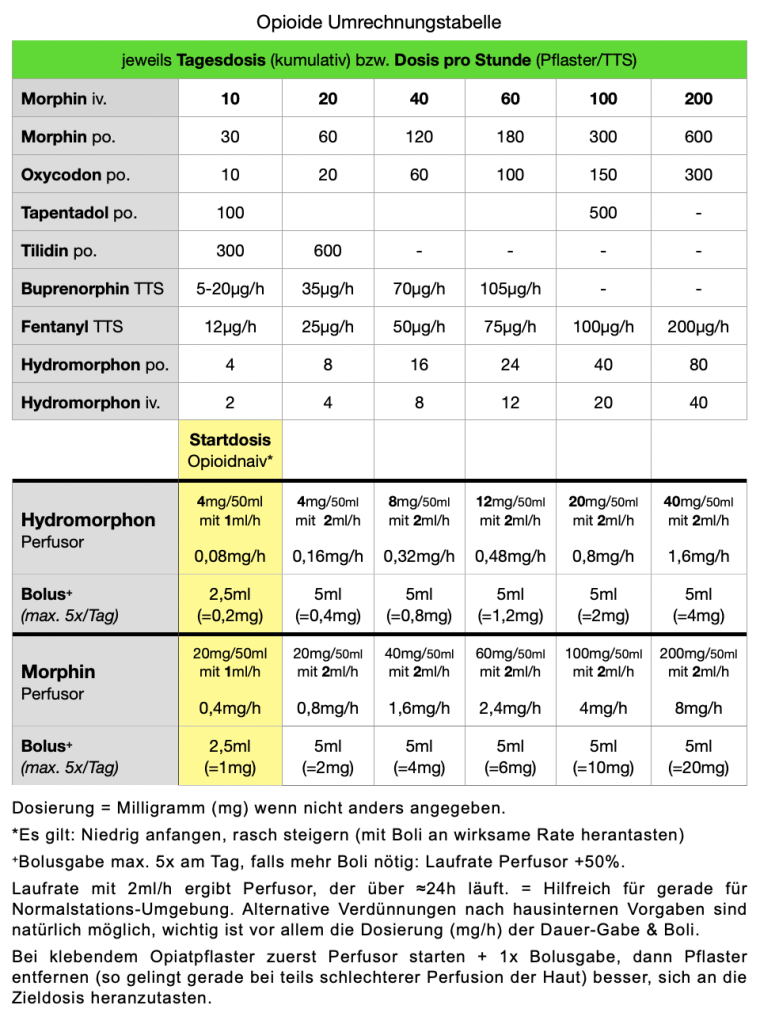 Umrechungstabelle Opioide sowie Vorschlag mit Perfusor-Verdünnungen für Morphin und Hydromorphon