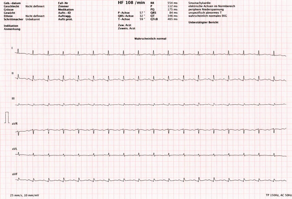 Aufgebrachtes “Ich möchte das nicht” und leichte Ausweichbewegungen der Patientin erschweren die Durchführung jeglicher Maßnahmen. Echten Widerstand leistet die Patientin beim Anbringen eines Basismonitorings und einer körperlichen Untersuchung dann aber doch nicht. Bei einer Atemfrequenz von 24/min lässt sich unter Raumluft eine SpO2 von 97% ableiten. Die Rekap-Zeit beträgt vier Sekunden, die Herfrequenz liegt bei 110/min. Der Blutdruck ist bei 110/70 mmHg. Zudem wird ein 12-Kanal EKG abgeleitet (siehe unten). Die Patientin präsentiert sich motorisch insgesamt unruhig und fingert ständig an den Kabeln und ihrer Kleidung herum. Eine Temperaturmessung ergibt 39,2°C. Bei der Auskultation der Lunge fallen basal beidseits feinblasige RGs auf. Eine orientierende Herzauskultation über Erb bleibt o.p.B.. Das Abdomen stellt sich weich und nicht druckdolent dar, die Peristaltik scheint unauffällig. Letzter Stuhlgang und Wasserlasen seien wohl ebenfalls unauffällig gewesen. Schmerzen werden verneint. Am linken Oberbauch fällt eine fast 20 cm große, quer verlaufende OP-Narbe auf. Beim Hochschieben ihrer Jogginghose zeigen sich von beiden Patellae ausgehende – etwa zwei Handflächen große – Marmorierungen der Haut. Zudem bestehen beidseits leichte Knöchelödeme.