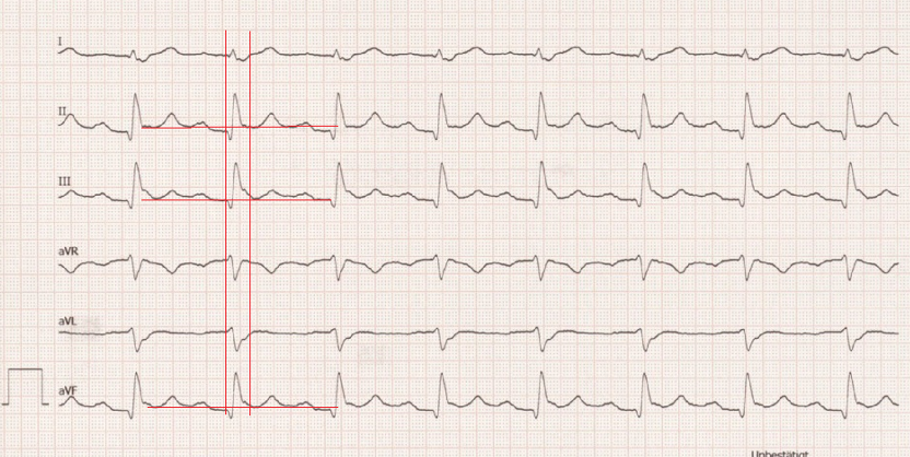 Letztendlich muss überlegt werden, ob als Referenzstrecke die PQ-Strecke oder die TP-Strecke (vom Ende der T-Welle bis zum Beginn der P-Welle) genommen wird. In diesem EKG ist die PQ-Strecke inferior tiefer angesetzt als TP. PQ-Strecken können durch Pathologien des Vorhofs verändert sein. Letztendlich zeigt sich keine signifikante ST-Hebung in diesem EKG, auch würde eine typische, kontralaterale Senkung in aVL fehlen. Es handelt sich um einen kompletten Rechtsschenkelblock, der mit solchen intraventrikulären Veränderungen einhergehen kann.