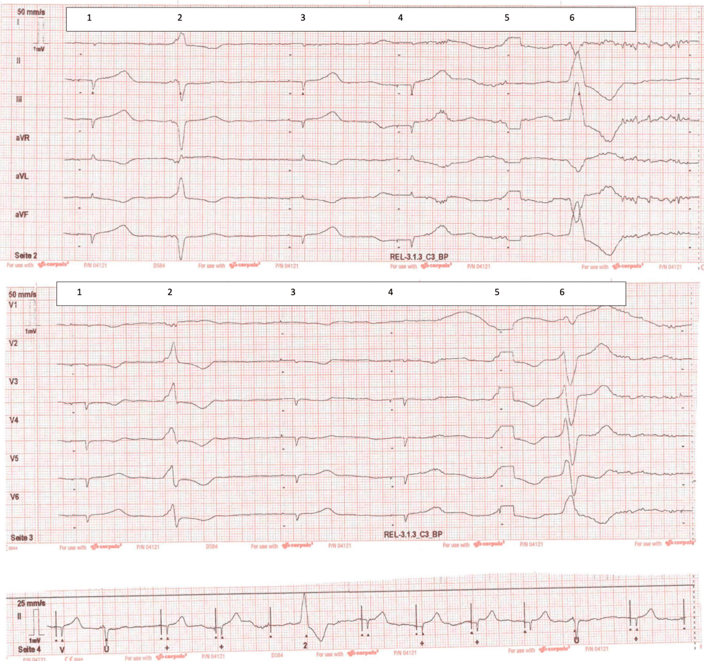 Zum Vergleich das Schrittmacher-EKG aus der Klinik derselben Patientin (siehe Bild mit EKG 3).