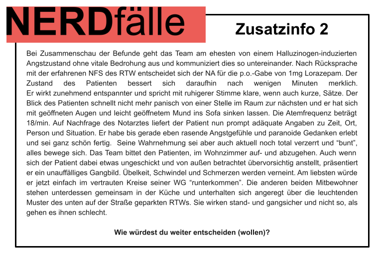 Bei Zusammenschau der Befunde geht das Team am ehesten von einem Halluzinogen-induzierten Angstzustand ohne vitale Bedrohung aus und kommuniziert dies so untereinander. Nach Rücksprache mit der erfahrenen NFS des RTW entscheidet sich der NA für die p.o.-Gabe von 1mg Lorazepam. Der Zustand des Patienten bessert sich daraufhin nach wenigen Minuten merklich.