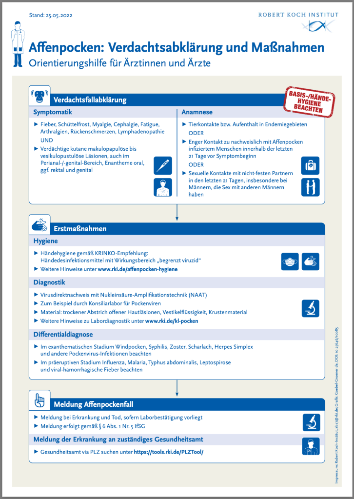 Hier gibt das RKI einen fokussierten Überblick zur den Affenpocken, inkl. Download als PDF.