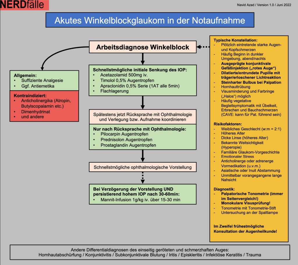 Bei Konstellation dieser Beschwerden sollte im Zweifel lieber großzügig von einem Winkelblockglaukom als Arbeitsdiagnose ausgegangen und schnellstmöglich mit einer Hemmung der Kammerwasserproduktion (s.u.) begonnen werden, um den Augendruck zu senken. Abweichende DDs können so zwar nicht ausgeschlossen werden, bei Einhaltung der unten abgebildeten Therapieempfehlung hat das aber keine Relevanz. Eventuelle Nebenwirkungen (z.B. Bulbushypotonie) sind – selbst bei falscher Arbeitsdiagnose – ungefährlich, reversibel und nicht relevant im Vergleich zur ggf. drohenden Erblindung eines Auges.