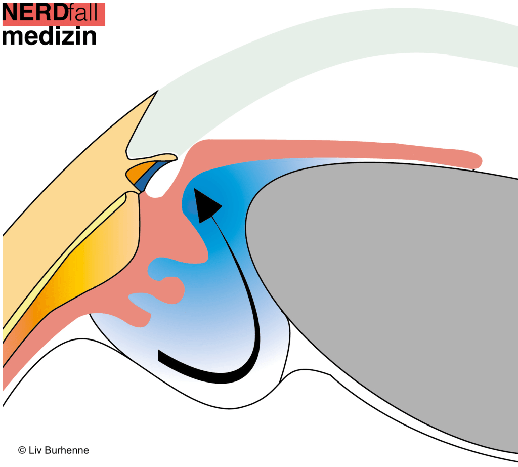 Häufigster Pathomechanismus ist der sogenannte Pupillarblock. Er entsteht bei flacher Vorderkammer, wenn die Rückseite der Iris der Linse eng aufliegt. Hierdurch wird der Fluss des Kammerwasser aus der hinteren Augenkammer in Richtung Pupille erschwert, was zu einem Druckgradient zwischen hinterer und vorderer Augenkammer führt. Dieser Zustand nennt sich „relativer Pupillarblock“. Kommt es nun bspw. zu einer Weitstellung der Pupille und der dafür nötigen Iris-Verdickung, kann der Abfluss des Kammerwassers zwischen Iris und Linse in Richtung Pupille vollständig unterbrochen werden – dann liegt ein totaler Pupillarblock vor. In der Folge staut sich das Kammerwasser in der Hinterkammer maximal an und drückt die zarte Iriswurzel nach vorne gegen die Hornhaut bzw. das Trabekelwerk, welches sich unmittelbar vor dem Schlemm-Kanal befindet. Dies ist durch den Pfeil in Abb. 2 dargestellt. Der Abfluss des Kammerwassers aus der Vorderkammer ist nun ebenfalls blockiert, während der Ziliarkörper in der Hinterkammer fröhlich weiter Kammerwasser freisetzt. Die Folge ist ein massiver Druckanstieg im gesamten Auge, der IOP kann Werte bis zu 80mmHg annehmen.