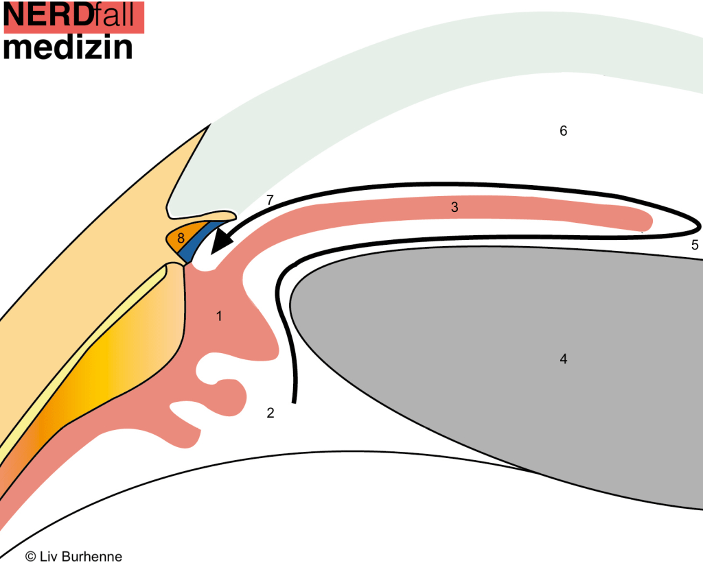 Die Epithelzellen des Ziliarkörpers (1) produzieren das Kammerwasser, welches von dort in die hintere Augenkammer (2) freigesetzt wird. Von hier aus zirkuliert es zwischen Iris (3) und Linse (4) hindurch zur Pupille (5), welche es passiert, um dann in die vordere Augenkammer (6) zu gelangen. Von der vorderen Augenkammer aus fließt es in den Kammerwinkel (7), an dessen Ende es über den Schlemm-Kanal (8) in ein Venengeflecht abfließen kann. Der Pfeil in Abb. 1 stellt diesen Fluss dar.