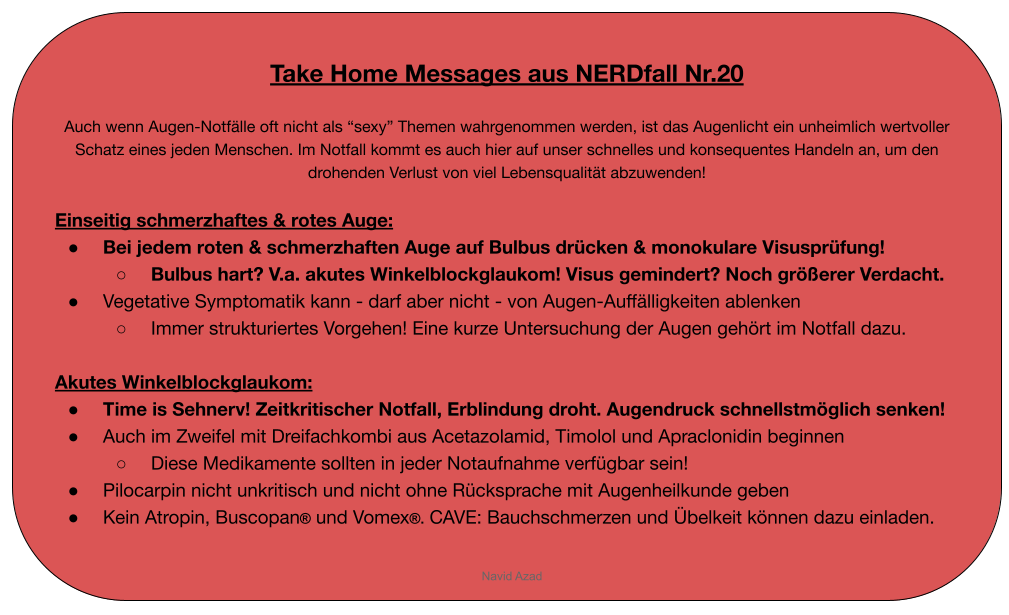 Und eventuell ist dieser Fall und Artikel ja auch Anstoß dazu, in den eigenen Notaufnahmen zumindest Acetazolamid, Timolol und Apraclonidin vorzuhalten oder sich einmal zu vergewissern, wo die Medikamente im eigenen Haus ggf. zu finden wären.