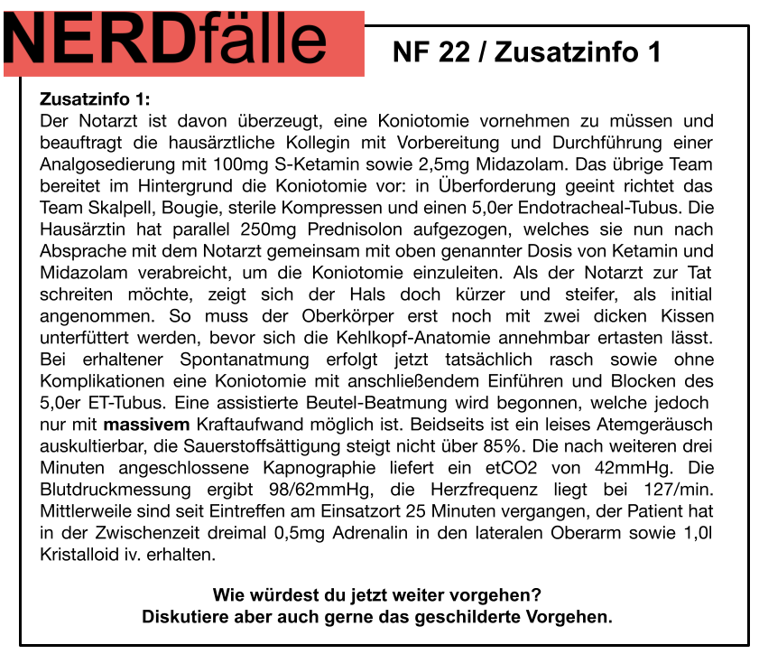 in den ersten Zusatzinformationen steht schon, wie die Beatmung nach der Koniotomie erschwert ist. Weitere Zusatzinformationen und die Auflösung mit umfassender Diskussion des Falls folgen in den nächsten Tagen. Wir sind gespannt 🙂
