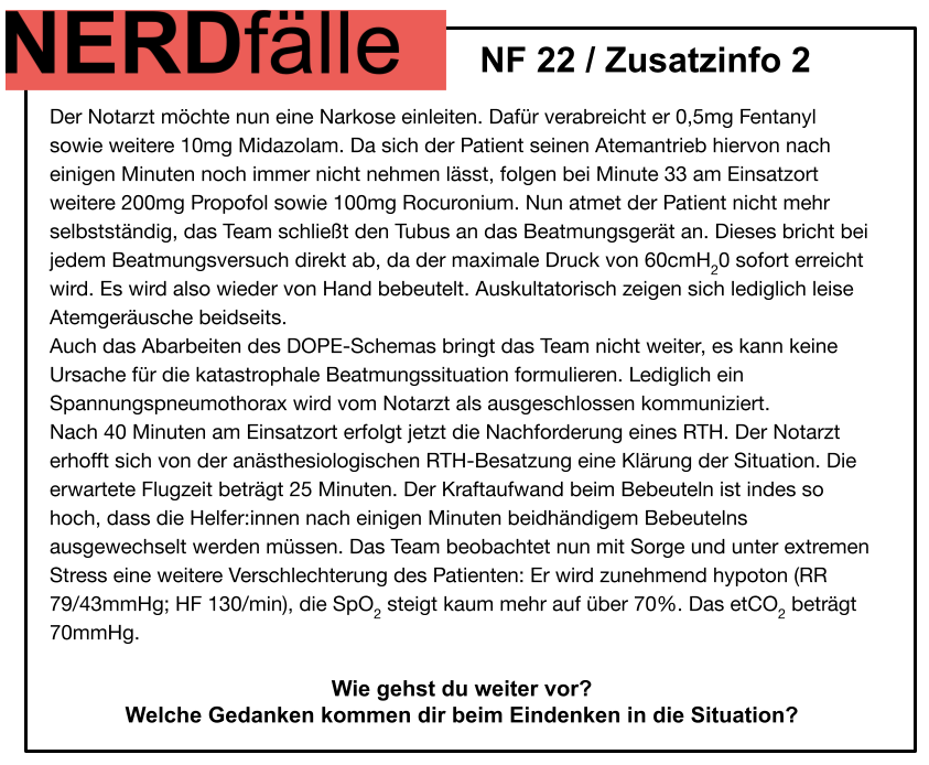 Hey und herzlich willkommen zurück zu den NERDfällen! In unserem 22. Fall tauchen wir tief in eine wirklich kritische Versorgung ein und sind natürlich gespannt auf eure Gedanken zum Vorgehen! Schreibt einfach hier in die Kommentare oder diskutiert in unserer Telegram-Gruppe mit der Community! Wir wünschen viel Freude! 🙂