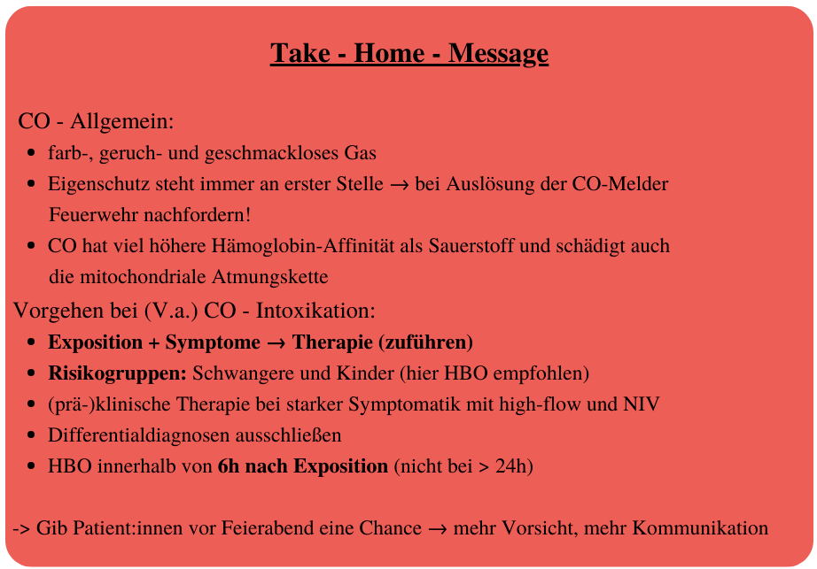 Eine Exposition mit CO kann auch nach erfolgreicher Behandlung zu kardialen und/oder neurologischen Langzeitschäden führen. Patient:innen sollen darüber aufgeklärt und eine Verlaufsuntersuchung nach 4-6 Wochen empfohlen werden. Bei Beschwerden sollten sie sich jederzeit wieder in eine medizinische Einrichtung begeben.
