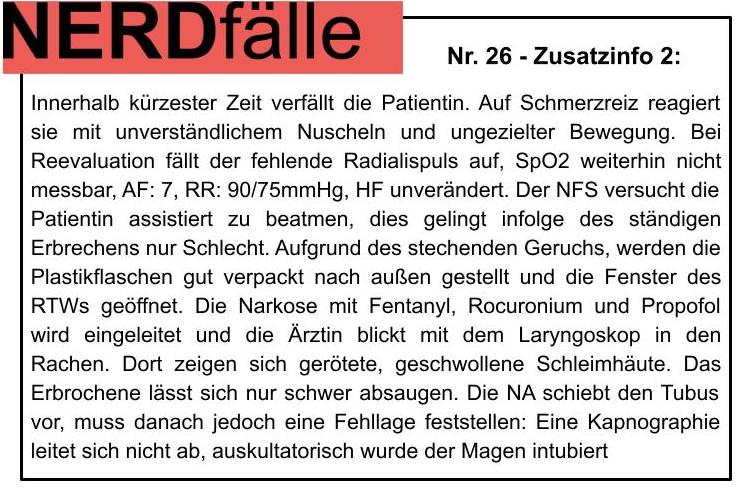 Vor dem Haus steht der Einsatzleiter der Feuerwehr, der die Situation als sicher einstuft und mit einem Kopfnicken das RTW-Team anwies das Haus zu betreten. In einer WG-Küche im zweiten Stock spricht die Notärztin einfühlsam mit einer jungen Frau. Die Patientin ist ca. Mitte 20, schlank und trägt ein altes, ausgebeultes T-Shirt und eine Jogginghose. Sie sitzt vornübergebeugt auf einem alten Holzstuhl. Der Blick wirkt starr, teilnahmslos Richtung Boden. Vor ihr steht ein Putzeimer mit leicht rötlich-schaumigen, geruchlosen Erbrochenem. Die Haut ist blass, glänzt jedoch im Licht der Küchenlampe, auf der Stirn stehen Schweißperlen. Die einzelnen, kurzen Antworten sind schwer zu verstehen, die Sprache ist kloßig. Bereits ohne Stethoskop ist ein grobblasiges, brodelndes Atemgeräusch in der Ausatmung wahrzunehmen.