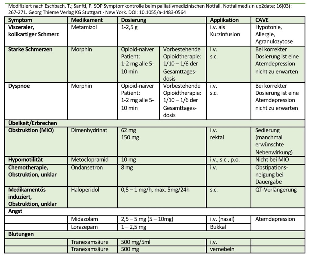 Eschbach, T.; Sanftl, P. SOP Symptomkontrolle beim palliativmedizinischen Notfall. Notfallmedizin up2date; 16(03): 267-271. Georg Thieme Verlag KG Stuttgart · New York. DOI: 10.1055/a-1483-0564