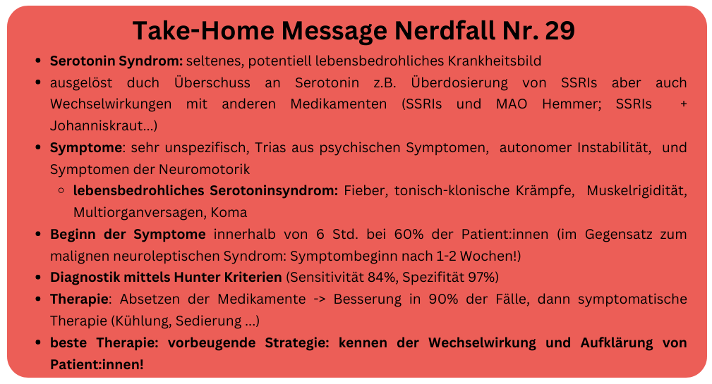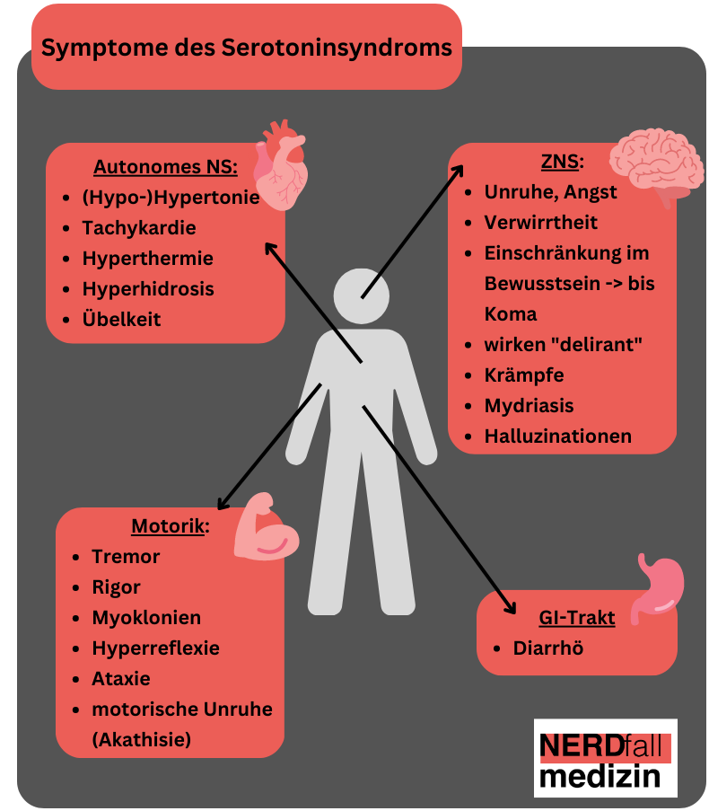 - Serotoninsyndrom ist schwer vom malignen neuroleptischen Syndrom (MNS) zu unterscheiden -> Abgrenzung durch Symptombeginn
