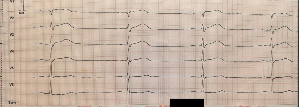 Hektisch werden die Kabel der EKG-Elektroden mit der Defi-Einheit konnektiert, etwa 25s nach Einsetzen der Rhythmusstörung wird erfolgreich defibrilliert. Danach zeigt sich erneut eine Sinusbradykardie (~60/min). Die Patientin wird nun auf den Boden verbracht, wo sie prompt erneut defibrilliert werden muss. Nach dem zweiten Schock ist Patientin deutlich agitiert und setzt sich auf. Das Team kann sie beruhigen, es werden 0,5mg Atropin verabreicht, woraufhin die Herzfrequenz auf ~70/min ansteigt.