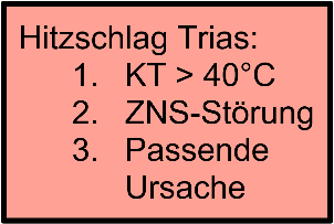 Hier kommt es durch ein Versagen der Thermoregulationsmechanismen zu einer Hyperthermie auf meist > 40°C. Mehrere Organsysteme sind betroffen, die ZNS-Symptomatik steht jedoch im Vordergrund, erkennbar z.B. an Ataxie, Wesensveränderung, Bewusstseinsstörung, Krampfanfall. Zwei Gruppen erleiden typischerweise einen Hitzschlag: Ältere Menschen bei hoher Außentemperatur und junge Sportler in Maximalleistung (auch schon ab 10°C Außentemperatur).