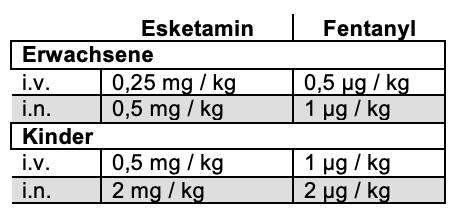 Esketamin und Fentanyl können bei starken Schmerzen eingesetzt werden. Die Wahl des Medikamentes, Verabreichungsform und Dosierung obliegt dem fachkundigen Anwender und wird nur durch diesen verantwortet.
