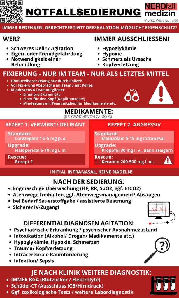 Die obige Infografik gilt für akut bedrohliche Situationen, NICHT für ein „allgemeines Delir“ ohne akute Selbst- oder Fremdgefährdung. Gerade bei älteren Patient:innen sollte ohne akute Bedrohung die Gabe von Benzodiazepinen vermieden werden! Hier die aktuelle Leitlinie zum Delirmanagement in der Intensivmedizin, hier eine Zusammenfassung des Themas „Delir“ im Ärzteblatt.