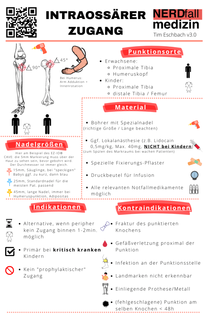 Kein i.v.-Zugang möglich? Kritischer Patient? Nicht nur bei Kindern kann ein intravenöser Zugang eine echte Herausforderung sein. Nicht immer gelingt es innerhalb kürzester Zeit einen solchen Zugang beim kritischen Patienten zu etablieren. Zum Rüstzeug des Rettungsteams gehört daher der intraossäre Zugang. Auch für den Schockraum empfehlenswert. Heute haben wir für euch eine Infografik mit den wichtigsten Infos.
