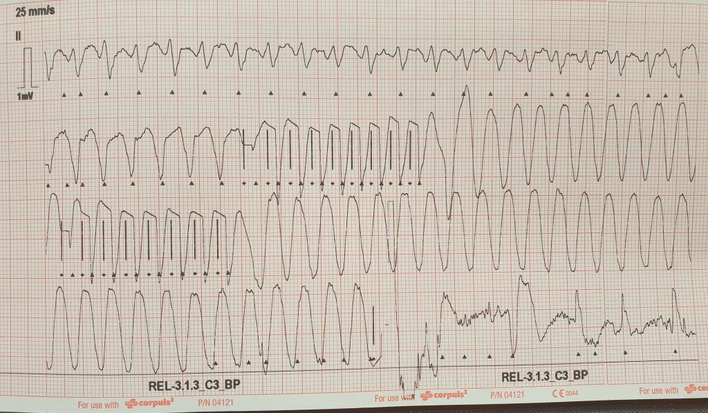 Es werden Blicke im Team ausgetauscht und die Entscheidung getroffen, nach einer zweiten Dosis Propofol ein drittes Mal zu schocken. Nun wird mit 200J kardiovertiert. Der Rhythmus hält sich weiter wacker. Es wird gesammelt entschieden, den soweit kreislaufstabilen Patienten nun mit diesem EKG-Bild nach telefonischer Absprache in den Zentralversorger zu transportieren.